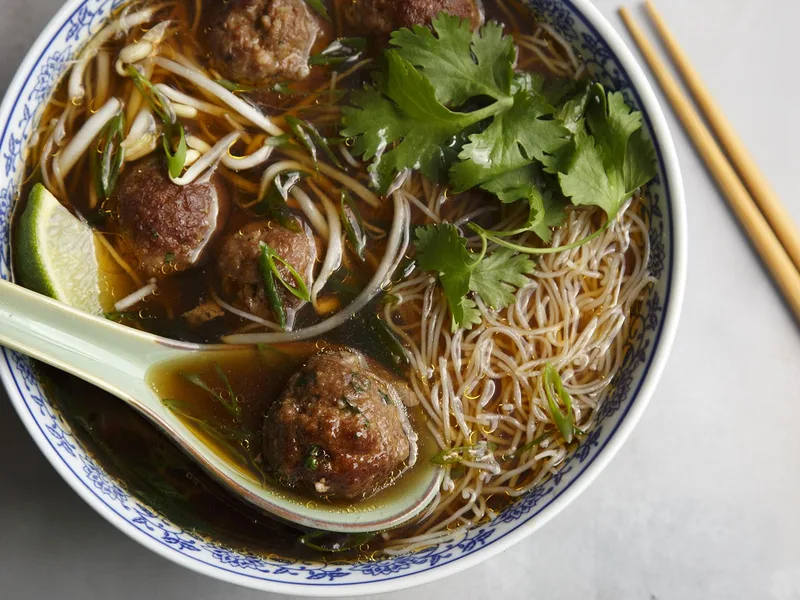 Pho-Inspired Meatball Soup with Rice Noodles