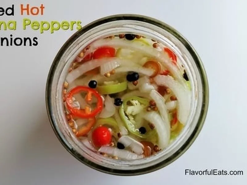 Tangy refrigerator pickles with sliced hot banana peppers, onions, and warm spices. Mustard and coriander seeds add complexity to the vinegar brine. Ready to eat after one day of chilling. Keeps for several weeks refrigerated.