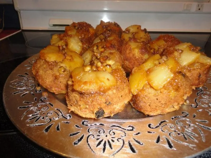 Immediately loosen edges and turn muffins out onto a baking sheet. Restore any stray pineapple pieces and nuts.