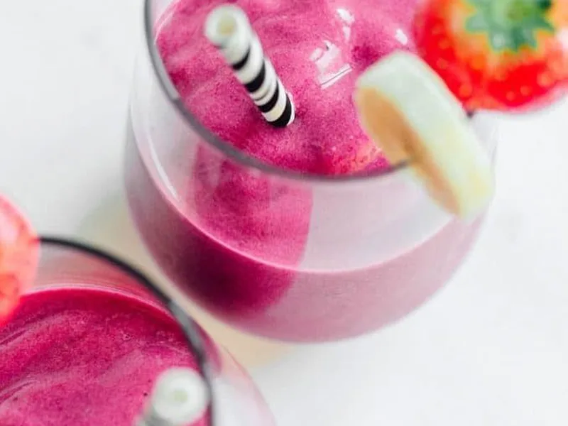 Vibrant smoothie combining roasted beets with frozen strawberries, banana, and strawberry yogurt. The beet is roasted until tender before blending to concentrate its earthy sweetness. Honey adds natural sweetness and milk adjusts consistency. Serve chilled for a nutritious, visually striking drink.