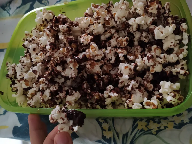 Homemade chocolate-coated popcorn made with a thick, glossy cocoa coating. Pop corn, then prepare a simple stovetop chocolate sauce using cocoa powder, sugar, margarine, and milk. The coating thickens as it cooks, then gets tossed onto warm popcorn until it hardens for a crunchy-chewy snack.