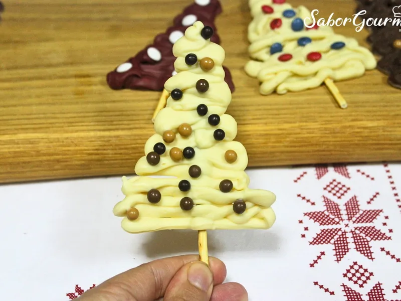 Three-chocolate holiday lollipops molded into tree shapes on Mikado sticks. Milk, white, and raspberry-inspired chocolate layers decorated with sugar sprinkles, chocolate spheres, and small candy pieces. Simple no-bake treats ideal for gifting or making with children.