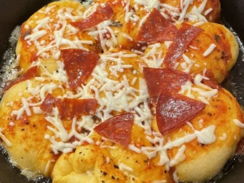 Buttery crescent roll dough wrapped around pepperoni, mozzarella, and marinara sauce, then baked until golden and topped with melted cheese. A handheld appetizer with crispy exterior and gooey center, served with warm marinara for dipping.