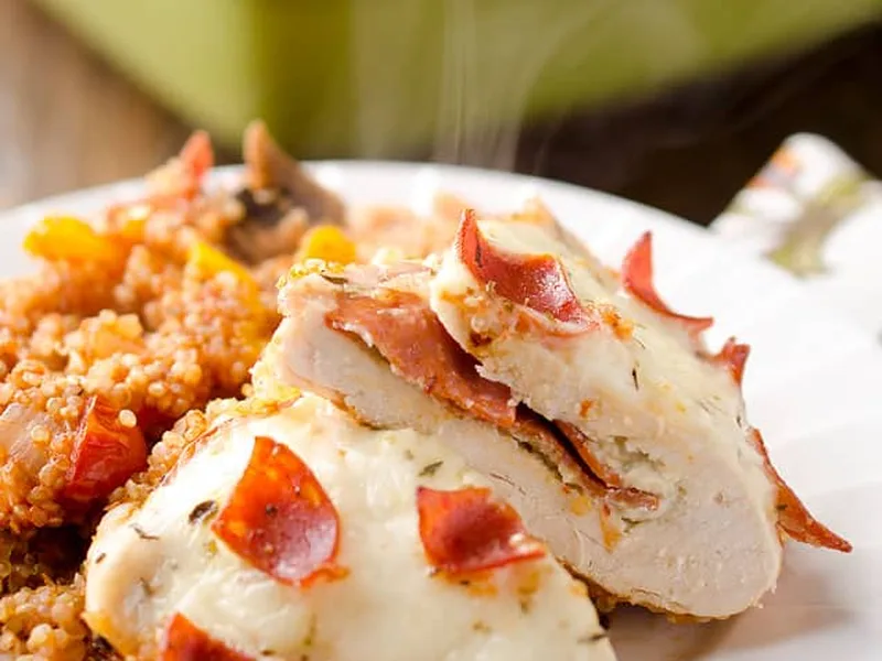 Chicken breasts filled with garlic herb cheese and pepperoni bake atop a pizza-flavored quinoa mixture with tomatoes, peppers, and mushrooms. Topped with mozzarella and turkey pepperoni, this one-pan casserole combines Italian flavors with protein-rich quinoa for a complete meal.