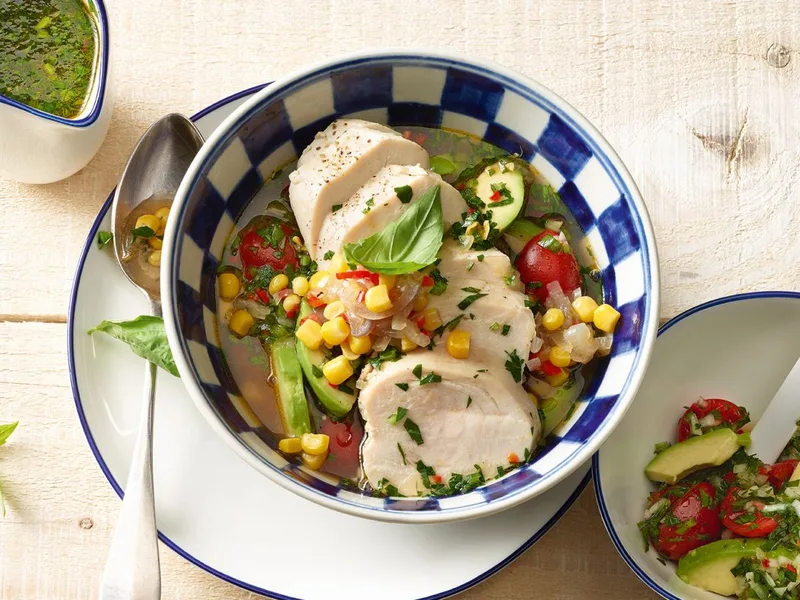A refined one-bowl dish combining tender poached chicken breast with sweet corn, creamy avocado, and a vibrant herb-tomato sauce. The chicken is gently poached in aromatic chicken broth infused with garlic, onion, parsley, and bay leaf, keeping the meat moist and delicate. Fresh basil and flat-leaf parsley form the backbone of a bright lime-dressed sauce studded with cherry tomatoes, spring onion, and chili heat. The interplay of textures—silky chicken, buttery avocado, tender corn, and crisp-fresh herbs—makes this dish sophisticated yet accessible. It suits home cooks seeking restaurant-quality results without complexity. Serve for light lunches, elegant dinners, or meal-prep bowls. This version stands apart by building three flavor layers: the poaching liquid imparts subtle depth, the herb sauce delivers brightness and lift, and the avocado adds richness that balances the chili and lime.