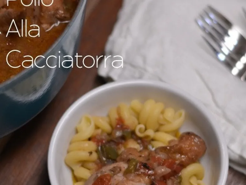 A rustic Italian braise of chicken pieces seared and simmered with sautéed vegetables, fire-roasted tomatoes, and red wine. The chicken becomes tender and absorbs the rich flavors of the Dutch oven dish, finished with fresh basil and served over egg noodles for a complete one-pot meal.