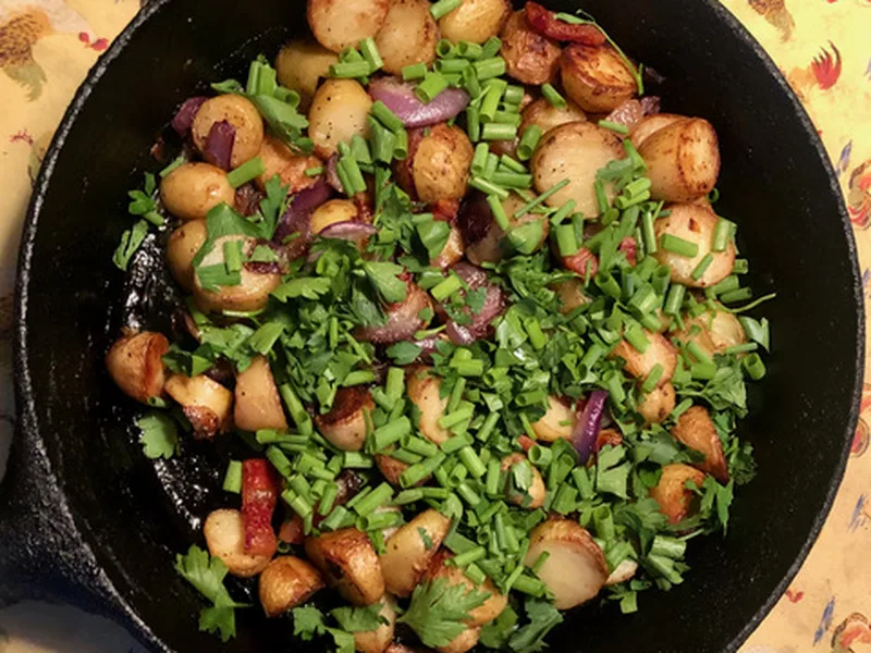 Rustic skillet dish of fingerling potatoes and red onions cooked until deeply browned, layered with crispy bacon lardons and fresh herbs. The potatoes develop caramelized edges while onions turn sweet and translucent, finished with scallions, parsley, and chives for brightness and color.