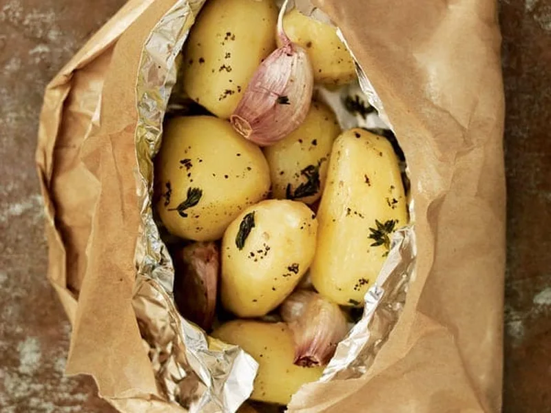 New potatoes steamed in foil parcels with whole garlic cloves, fresh thyme, and butter. The packets puff dramatically in the oven, trapping aromatic steam that guests release tableside. Simple, elegant, and requires minimal active cooking.
