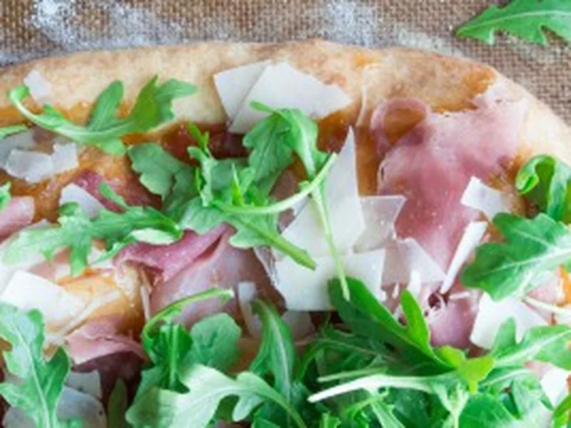 Bake the dough and cool completely up to 4 hours ahead. Add jam and prosciutto 20 minutes before serving, then top with Parmesan and arugula just before slicing. This keeps arugula crisp and flavors bright.