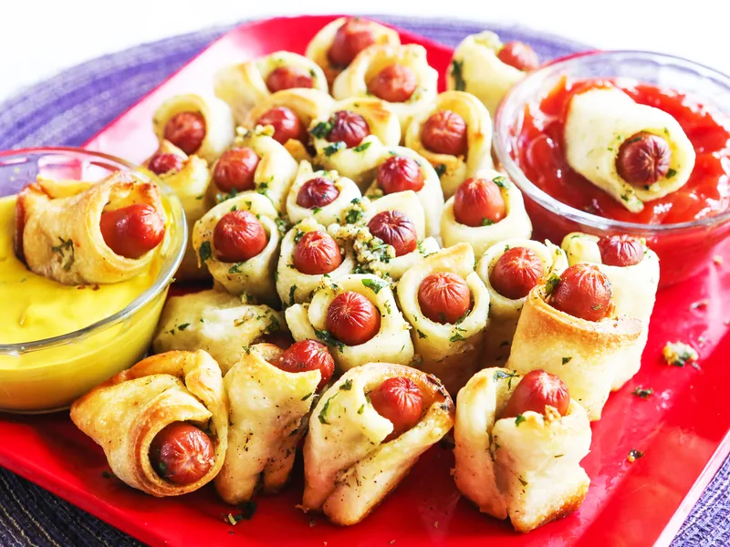 Individual sausages wrapped in pizza dough and arranged in a pull-apart ring. Brushed with garlic herb butter, baked until golden, and served with ketchup, marinara, or mustard for dipping. A crowd-pleasing appetizer or snack that's as fun to eat as it is to prepare.