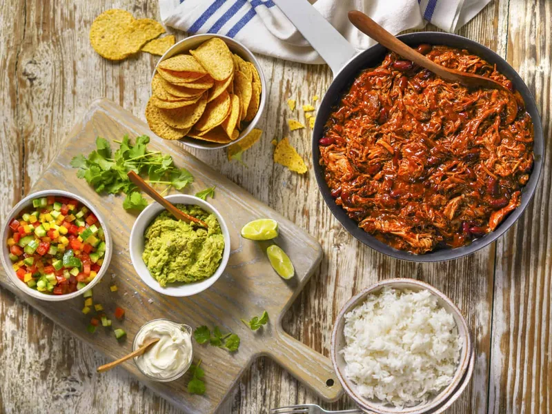 A vibrant, deconstructed nacho experience built on fluffy white rice instead of chips. Seasoned pulled pork and kidney beans form a savory, spiced base that's balanced by fresh tomato salsa, creamy guacamole, and tangy sour cream. Crisp diced capsicum and cucumber add textural contrast to soft avocado and tender pork. This is weeknight comfort food for anyone seeking quick assembly without sacrificing brightness. The bowl format makes it naturally customizable and portion-controlled, ideal for casual family dinners, meal prep, or laid-back entertaining. What sets this version apart is the rice foundation—more substantial and forgiving than traditional nacho platters—combined with the fresh vegetable medley that prevents the dish from feeling heavy. Lime-kissed guacamole and aromatic coriander leaves enhance store-bought pulled pork into something that tastes genuinely homemade.