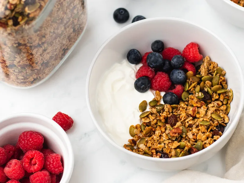 Homemade granola combining toasted oats, pecans, and pumpkin seeds with warm spices of cinnamon, ginger, and nutmeg, bound together with coconut oil and agave syrup, then finished with plump raisins. The result is a crunchy, nutrient-dense breakfast staple with natural sweetness and autumn spice notes. Ideal for serving over yogurt, with milk, or eaten straight as a snack. This version prioritizes whole ingredients and minimal processing for maximum texture and flavor depth.
