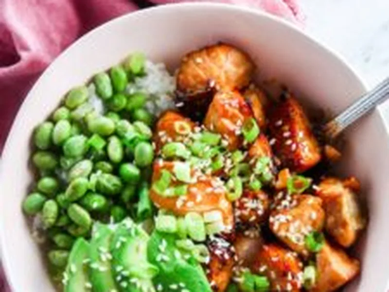Serve over rice with steamed edamame, avocado, green onion, and white sesame seeds.