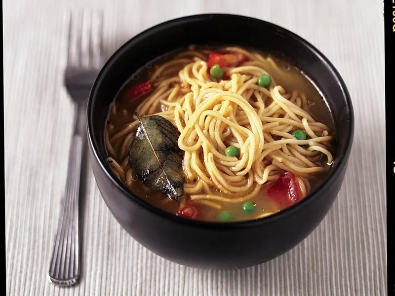 A vibrant one-pot curry noodle dish that delivers bold balti spice in under 10 minutes. Dried egg noodles cook directly in a fragrant curry paste base infused with fresh curry leaves, creating a cohesive broth rather than a stir-fry. Cherry tomatoes and frozen peas add brightness and texture contrast against tender noodles. This recipe suits busy weeknight dinners, meal prep, or quick lunches when you need satisfying comfort food without fuss. The cooking method—boiling noodles in the curry liquid rather than cooking separately—concentrates flavor throughout and eliminates extra dishes. Fresh curry leaves distinguish this from standard curry noodle packets, while the balti paste provides consistent heat and depth that overshadows generic curry powders.