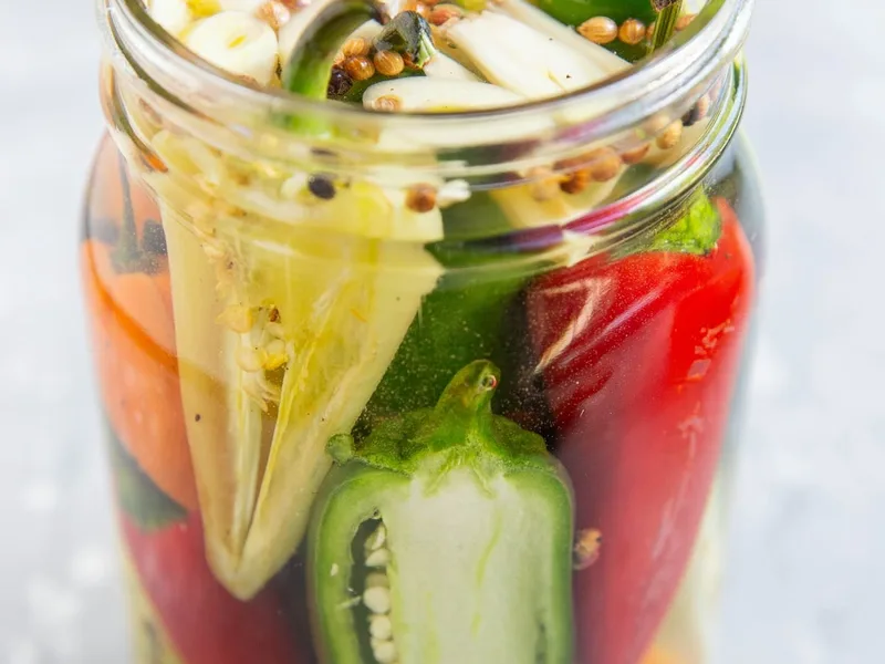 Slice some chilies lengthwise before jarring to maximize spice release into the brine; milder varieties benefit from this technique.