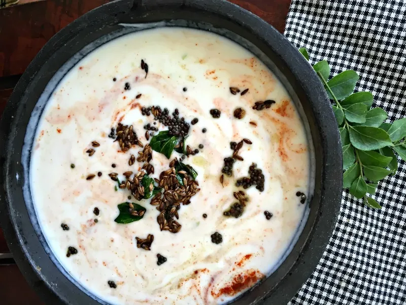 Tempering oil must actively bubble and crackle when poured into cool yogurt to release spice volatiles and prevent mustard bitterness. Never skip the sputtering—it changes the entire dish.