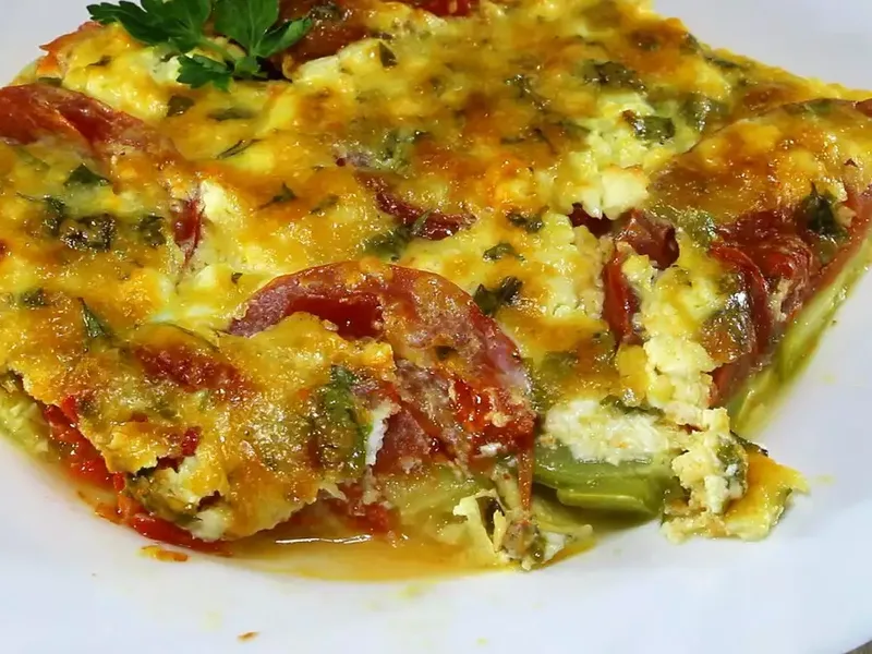 Sheet pan zucchini bake layered with roasted peppers, tomatoes, and feta, topped with a savory egg and cheese custard. Baked until golden and set. Simple weeknight dinner or brunch dish with Mediterranean flavors, ready in under 45 minutes.