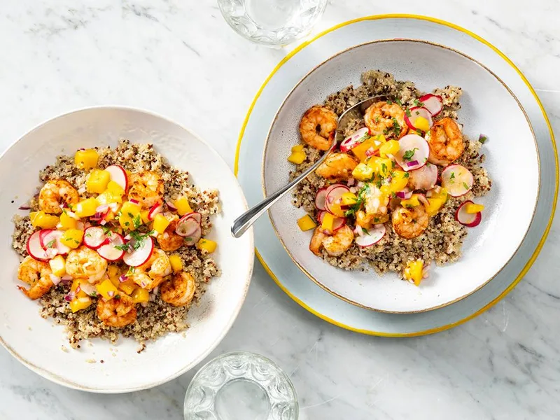 Fluffy tri-colored quinoa base topped with seared chili-spiced shrimp and fresh mango salsa with crisp radish slaw. Quick weeknight dinner balancing protein, whole grains, and bright citrus and fruit flavors.