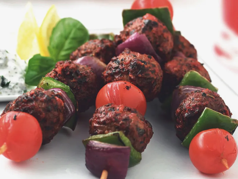 Marinated Quorn meatballs threaded onto skewers with peppers, onions, mushrooms, and tomatoes, then grilled until caramelized. Served with a cooling garlic yogurt dip flavored with lemon and fresh herbs. Quick weeknight dinner or BBQ option.