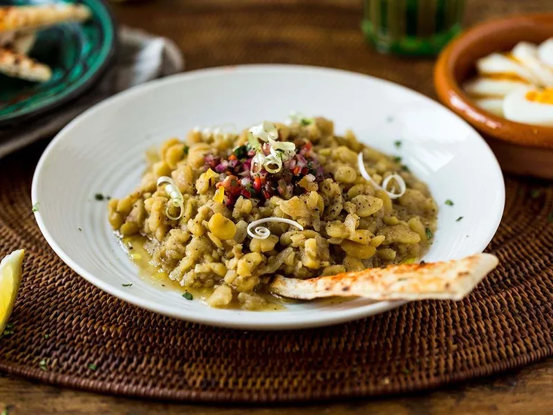 Egyptian mashed fava bean dip seasoned with cumin, garlic, and fresh lemon juice. Simmered until tender, then mashed to a semi-smooth consistency and served warm with a pool of olive oil. Topped with hard boiled eggs, tomatoes, onions, and fresh herbs for a classic Middle Eastern breakfast or appetizer.