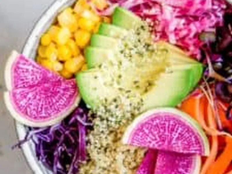 Vibrant grain bowls layered with spinach, quinoa, shredded vegetables, and fresh radishes, topped with creamy maple tahini dressing and hemp seeds. Build colorful sections of roasted beets, corn, carrots, cabbage, and avocado for a nutrient-dense meal with balanced textures and bright citrus-maple flavor.