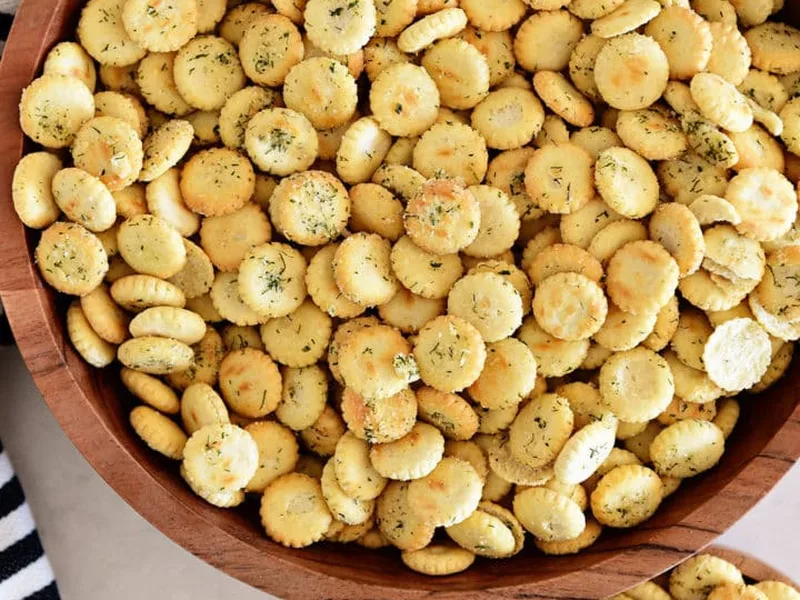 Crispy, seasoned oyster crackers coated in vegetable oil and ranch seasoning with dill and garlic. Baked low and slow for 20 minutes to achieve a crunchy texture. A simple savory snack that's ready in under 30 minutes.