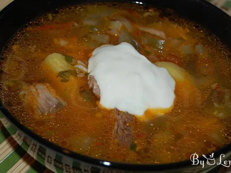 Traditional Russian soup built on a long-simmered beef bone broth, enriched with pickled cucumbers, tomato paste, and a soffritto of caramelized onions and carrots. The tangy pickle brine and rich meat stock create the soup's signature balance. Finished with fresh parsley and served optionally with sour cream and raw onion.
