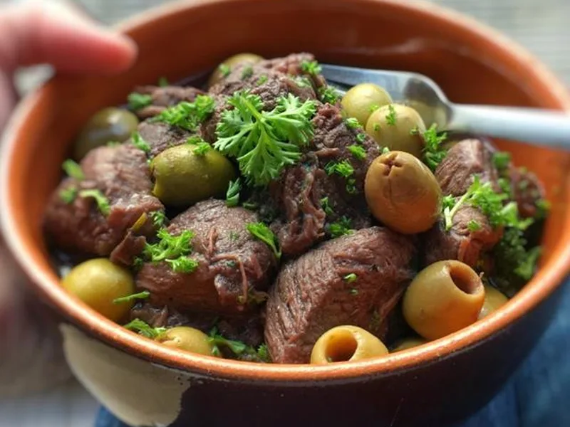 A rustic, deeply savory beef stew braised low and slow in red wine with bay leaf, thyme, and briny green olives. The beef becomes tender enough to break apart with a spoon, while the sauce develops rich, complex flavors from hours of simmering. Perfect for cool evenings, special dinners, or feeding a crowd. This version distinguishes itself with whole pitted olives added late to preserve their texture and bright brine against the wine's depth.