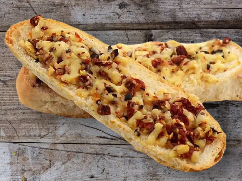 Open-faced hot dog rolls topped with sun-dried tomatoes, garlic, chilli flakes, melted mozzarella, and olives. Quick Mediterranean-inspired appetizer baked until cheese melts, then cut into bite-sized pieces. Ready in under 15 minutes.