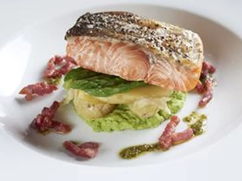 Heat the remaining oil in another pan over high heat. Score the salmon skin and season with sea salt and cracked pepper. When the pan is hot, place salmon skin-side down for 2 to 3 minutes, then turn. Transfer to the oven and cook for approximately 8 to 10 minutes until the skin is golden and flesh is firm.