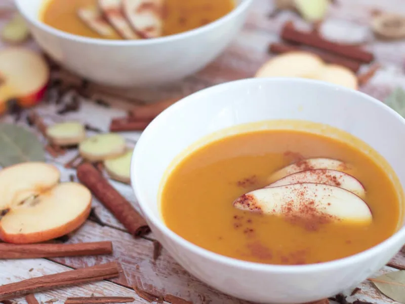 Silky roasted apple and red kuri squash soup enriched with warming spices like cumin, coriander, and cinnamon. Fresh apple cider and ginger add brightness to this vegan-friendly comfort soup, finished with crispy apple garnish and a dusting of spice.