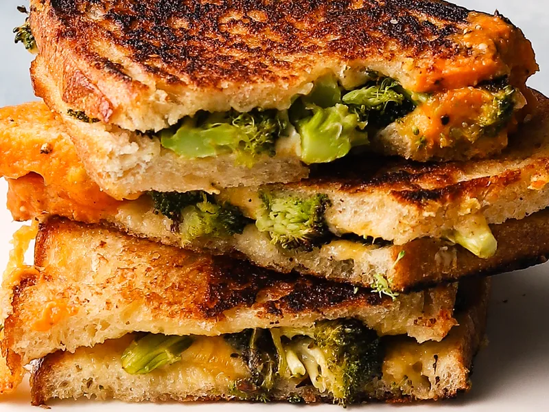 Crispy sourdough sandwiches loaded with melted sharp and medium cheddar cheese paired with roasted broccoli florets. The broccoli adds earthy sweetness and texture to this comfort classic, while mayo-spread bread ensures even toasting and golden crispness. Serve for lunch, casual dinner, or as a hearty vegetarian sandwich. This version combines oven-roasted vegetables with stovetop cooking for layered flavors and a satisfying melt.