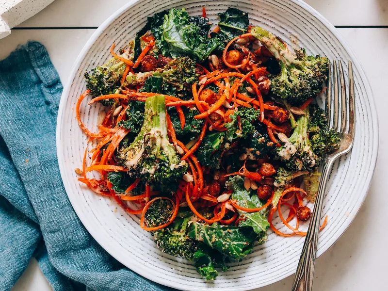 A vibrant, protein-packed salad combining massaged kale with roasted broccoli and cumin-smoked chickpeas, finished with fresh carrots, avocado, and sunflower seeds. The maple-lime dressing tenderizes the kale while warming spices echo through the roasted vegetables. Serve as a satisfying lunch or light dinner for health-conscious eaters who want bold flavors without heaviness. This version emphasizes the spice-forward roasting technique and the massage-tenderizing trick that transforms raw kale into buttery greens.