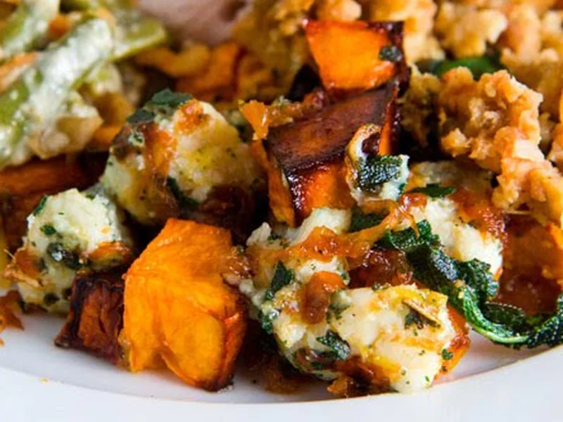 This rustic autumn dish combines sweet roasted butternut squash cubes with slowly caramelized onions and tangy gorgonzola cheese, finished with crispy sage leaves in brown butter. The natural sweetness of the squash pairs beautifully with the deep, complex flavors of the caramelized onions, while the gorgonzola adds a creamy, pungent contrast. Perfect as an elegant side dish for holiday meals or a satisfying vegetarian main course. The crispy sage and nutty brown butter provide an aromatic finish that transforms simple ingredients into something special.