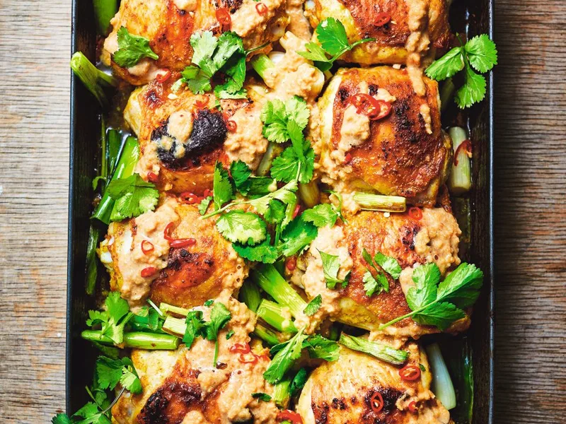 A Southeast Asian-inspired roasted chicken dish that combines tender, marinated chicken thighs with a rich coconut-peanut sauce balanced by bright lime and fresh chilli heat. The magic lies in the aromatic paste of garlic, lemongrass, turmeric and coriander that infuses the chicken during marinating, then transforms into a creamy sauce when blended with roasted peanuts and coconut milk. The result is deeply savory with subtle sweetness, textured by whole peanuts and fresh herbs scattered across golden, charred chicken. This is ideal for anyone seeking impressive weeknight or weekend entertaining without fussy techniques. Serve it family-style for casual gatherings or plated for more formal occasions. What sets this version apart is the two-stage peanut use: half ground into the sauce for depth and body, half left whole for satisfying crunch and visual appeal.