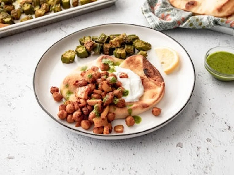 A creative fusion take on Trinidad's beloved street food featuring roasted spiced chickpeas instead of traditional curried channa, served on warm naan with tangy yogurt and chermoula drizzle. The addition of crispy roasted okra transforms this into a complete meal that bridges Caribbean and Middle Eastern flavors. Perfect for casual dinners or weekend lunches when you want bold, satisfying flavors with minimal hands-on cooking time.