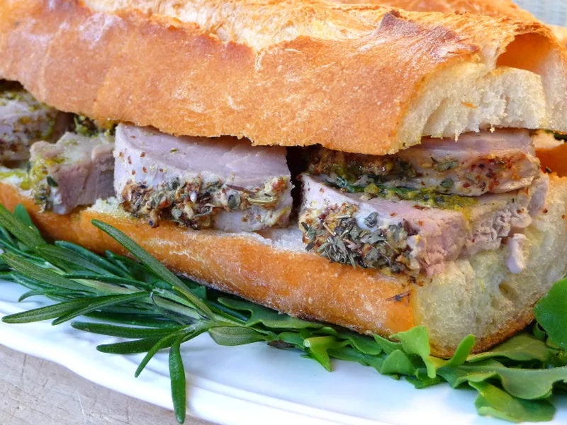 A straightforward roast chicken-adjacent method produces a juicy, herb-crusted pork loin with bright mustard undertones and garlic aromatics throughout. The coarse-grain Dijon creates a flavorful crust while herbes de Provence adds complexity. Ideal for weeknight dinners or casual entertaining, this version distinguishes itself through the garlic-slit technique, which infuses the meat directly rather than relying on external seasoning alone.