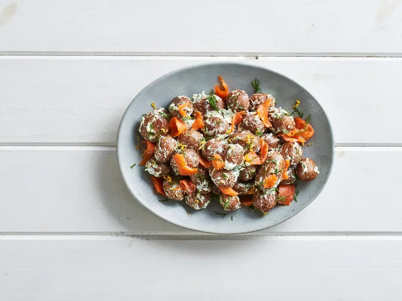 Transfer hot potatoes to serving bowl, fold in cream cheese mixture gently, top with smoked salmon, and serve.