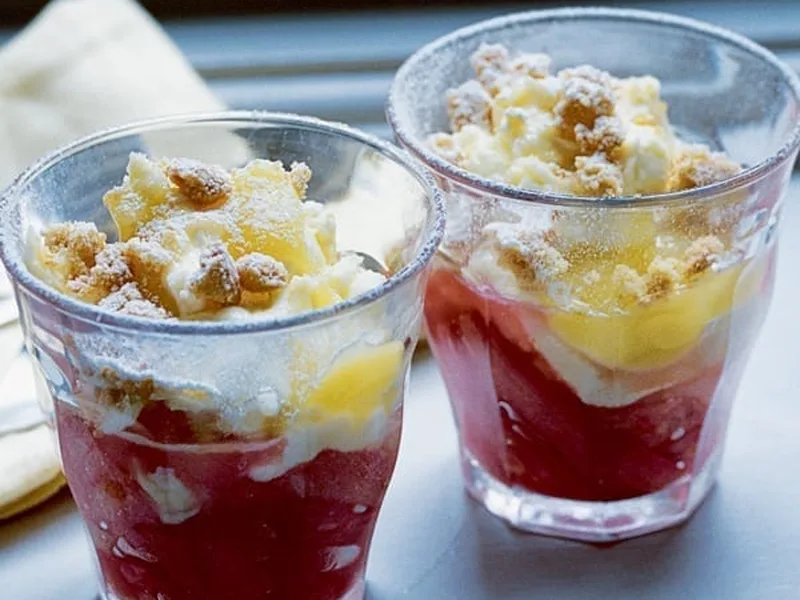 A stunning no-bake dessert that pairs tart roasted rhubarb with creamy lemon curd mascarpone and crisp ginger biscuit crumble. The rhubarb is briefly roasted with orange juice and butter until tender, then layered with a rippled mixture of lemon curd and mascarpone for richness and tang. The stem ginger biscuits add textural contrast and subtle spice. This elegant dish works for dinner parties, special occasions, or elegant weeknight desserts. It's quick to assemble, requires minimal skill, and impresses with sophisticated layering and bright citrus flavors. The contrast between warm roasted fruit, cool creamy filling, and crunchy topping creates complexity from simple components. Perfect for spring entertaining when forced rhubarb is at its peak.