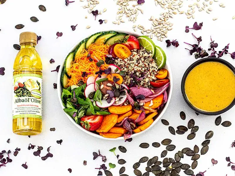 A Buddha bowl is a nutrient-dense, colorful grain bowl combining warm roasted vegetables, protein-rich quinoa, fresh raw vegetables, and a tangy curry-mustard dressing. This German-style version balances earthy sweet potato and creamy nuts with bright strawberries and peppery radishes, creating complexity across textures and flavors. The appeal lies in its customizable nature: you build your own balance of greens, grains, proteins, and healthy fats. Perfect for meal-prep lunchers, health-conscious eaters, and anyone seeking satisfying plant-based meals. Serve it warm or at room temperature for lunch, dinner, or light supper. What sets this version apart is the unexpected pairing of strawberries with curry-spiked vinaigrette and premium almond oil, adding subtle sweetness and richness that enhance simple bowl ingredients into something sophisticated.