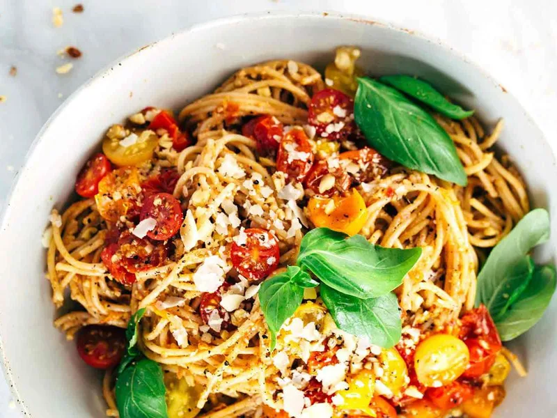 A vibrant twist on classic pesto, this dish combines roasted cherry tomatoes, toasted walnuts, and fresh basil with anchovy umami and bright lemon. The tomatoes add sweetness and acidity while the walnuts replace traditional pine nuts for earthiness. Serve warm as a main course for weeknight dinners or light lunches. This version balances herbaceous basil against caramelized tomato depth, creating a more complex pesto than raw versions.