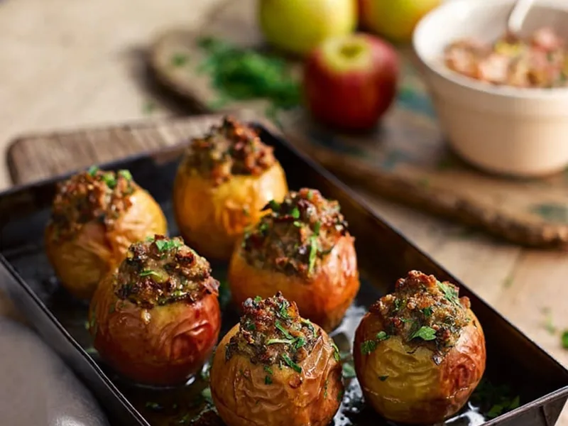 Store leftover stuffed apples in an airtight container in the refrigerator for up to 2 days. Reheat gently in a 160°C oven for 15-20 minutes with a splash of water to prevent drying.