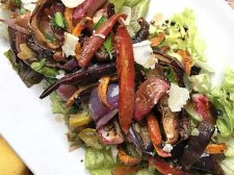 A composed salad of roasted seasonal vegetables with caramelized edges and bright herb finish. The eggplant is salted to remove moisture, then all vegetables are roasted until golden and tender, finished under the broiler for deeper color. Roasted garlic cloves add sweet, mellow depth. Served chilled or at room temperature over butter lettuce with Parmesan and balsamic drizzle. This version emphasizes technique and timing to achieve both tender interiors and crispy, darkened edges that define the dish's character.