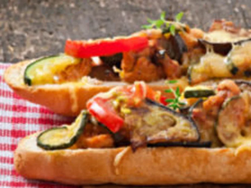 Hearty open-faced sandwiches loaded with oven-roasted eggplant, zucchini, cauliflower, bell pepper, and onion, topped with fresh tomato slices and melted provolone. A garlicky herb-infused oil and red wine vinegar dressing brings brightness to the tender, caramelized vegetables. Ready in about 35 minutes.