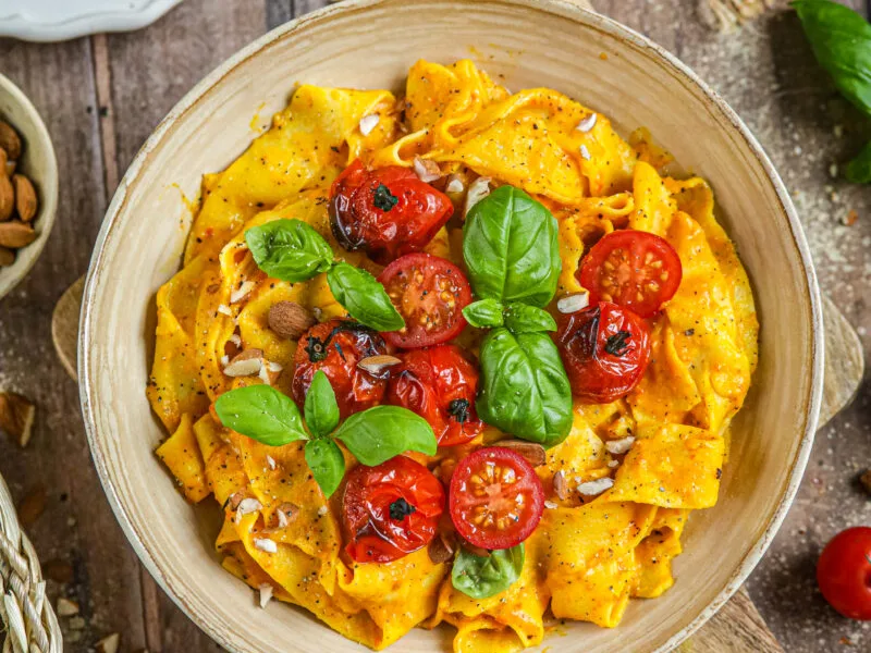 Creamy Pumpkin Almond Pasta with Roasted Tomatoes