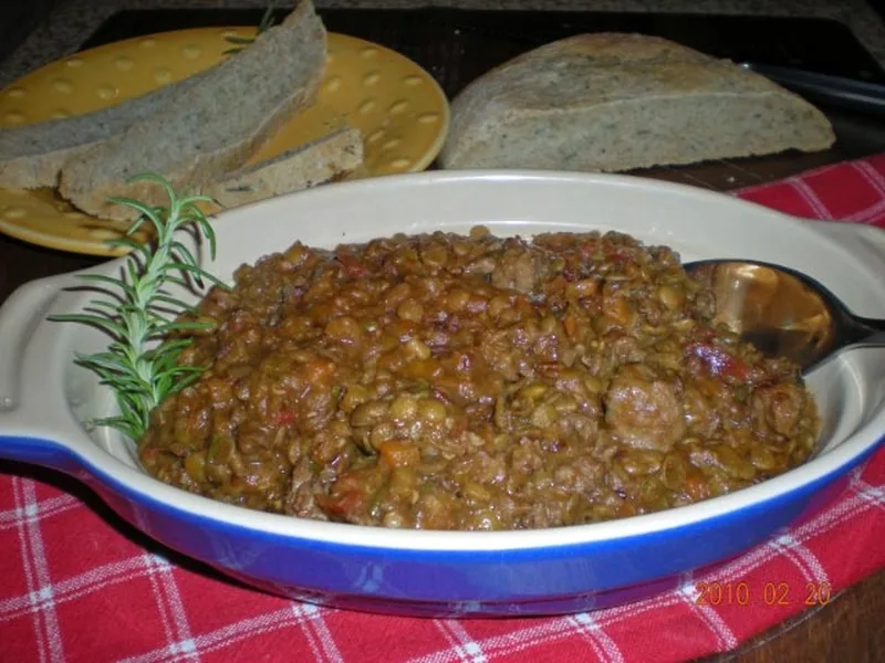 Overcoil lentils before adding sausage mixture to avoid mushy final texture; start checking tenderness at 15 minutes into final simmer.
