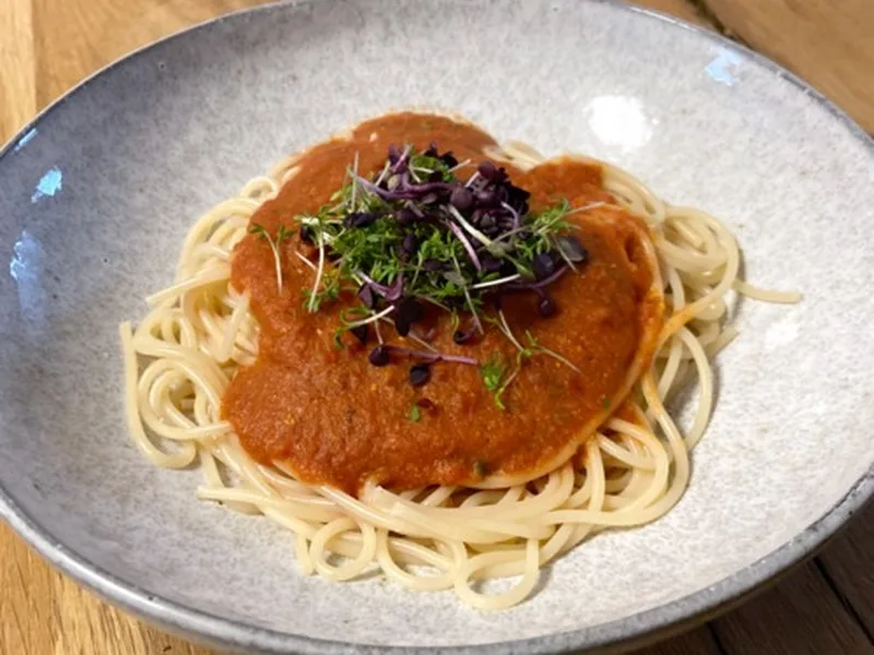 Silky red lentil and roasted vegetable sauce without tomatoes, built on ghee-bloomed spices. Beetroot and carrots create natural sweetness and body. Quick 15-18 minute simmer, finished with fresh herbs and lemon. Serve over pasta or rice with optional cheese and greens.