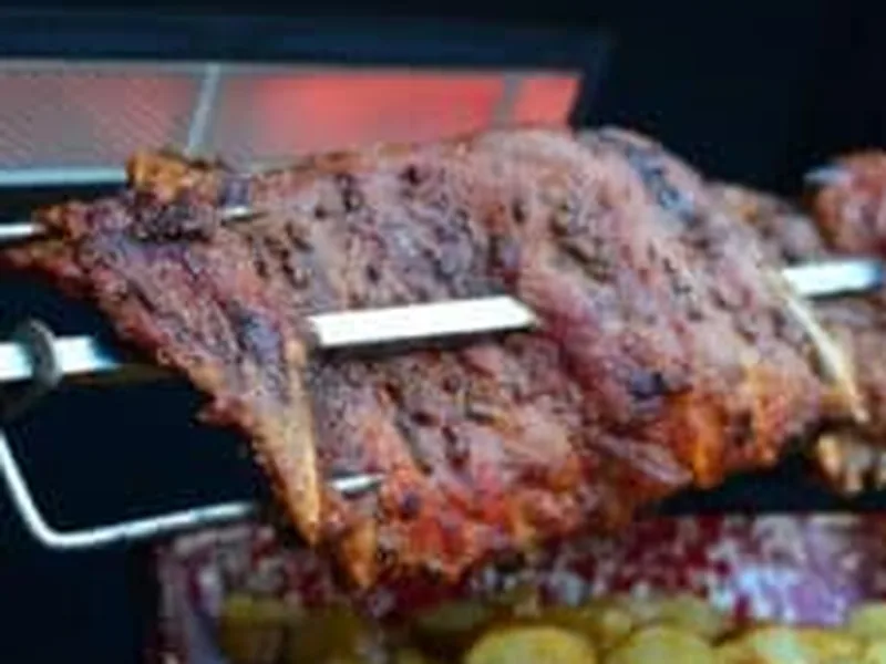 St. Louis cut pork spareribs seasoned with kosher salt, black pepper, dried oregano, smoked Spanish paprika, and minced garlic, then rotisserie-cooked low and slow over indirect medium-low heat until bones pull back and meat is deeply browned. The long cooking time renders fat and develops a flavorful crust while keeping meat tender.