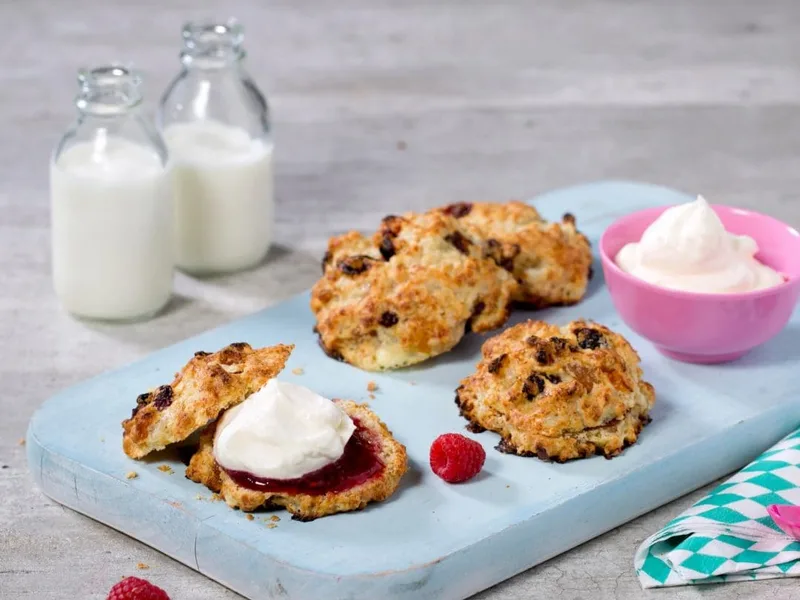 Norwegian-style sweet scones combining oats, spelt flour, and creamy cottage cheese, studded with dried fruit. Baked until golden and served warm with raspberry jam and whipped cream for a simple yet satisfying treat.