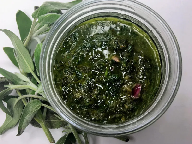 A vibrant herb pesto that departs from the traditional basil formula by combining fresh sage and parsley with bright lemon juice and red wine vinegar for complexity. The crushed texture and visible herb pieces distinguish this from smooth, emulsified dressings. Red pepper flakes add a subtle heat that complements the citrus and wine notes. This pesto works for anyone seeking a less common green sauce for pasta, vegetables, grilled meats, or cheese boards. Serve it fresh as a condiment, spread, or sauce during warmer months when fresh herbs are abundant. The sage brings an earthy, slightly peppery character while lemon cuts through richness, making this ideal for lighter spring and summer dishes where basil might feel predictable.